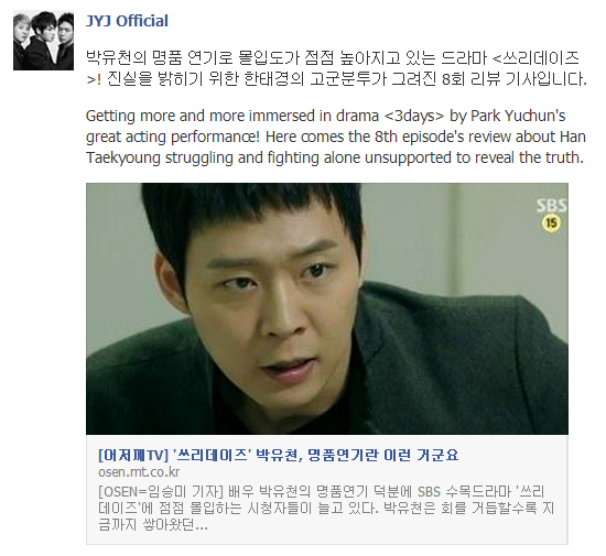 [FACEBOOK] 140328 JYJ ACTUALIZACIÓN OFICIAL: RESEÑA DEL EPISODIO 8 DE ‘THREE DAYS’ , SORPRESA DE JUNSU, VÍDEO DETRÁS DE ESCENA DEL EPISODIO 7 DE ‘THRE