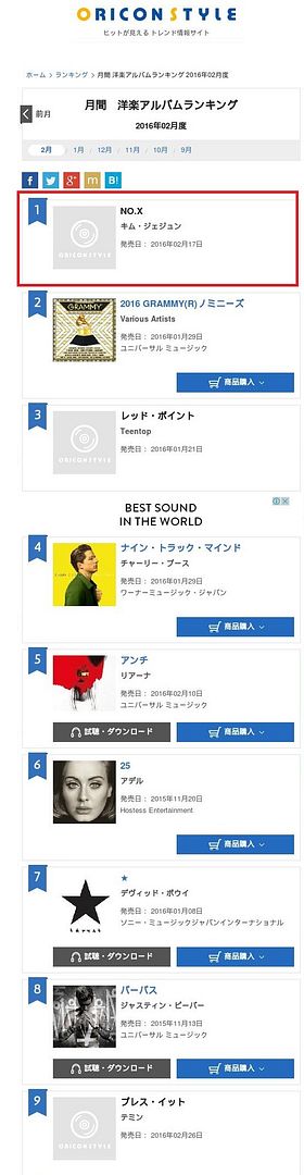[INFO] 160328 El álbum NO.X Album de Kim Jaejoong en la cima del Ranking mensual de albúmenes extranjeros de ORICON (Febrero 2016)
