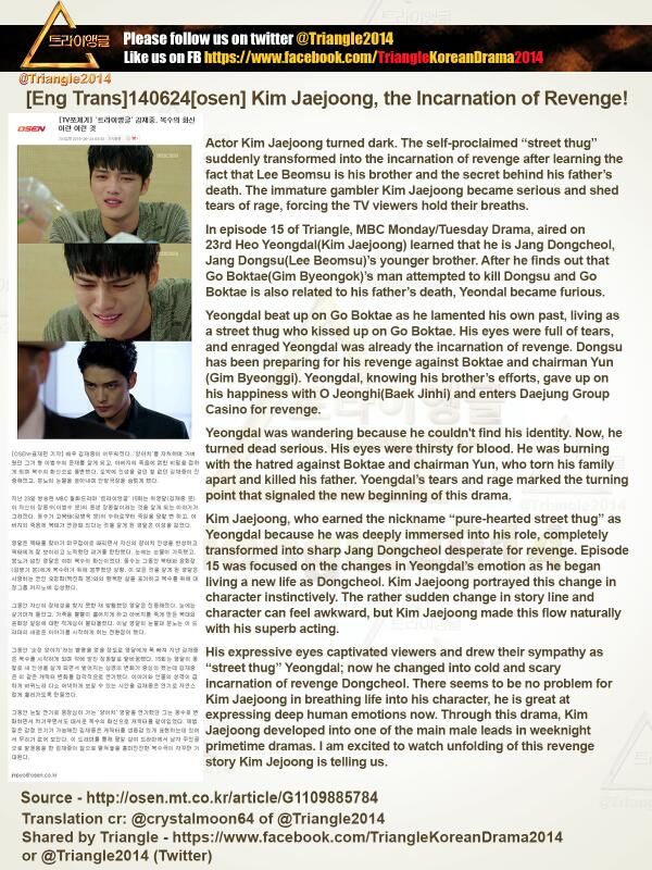 Sus expresivos ojos capturaron los corazones de los espectadores y marcaron su simpatía hacia el “gánster callejero” Youngdal; ahora él ha cambiado a su fría y atemorizante encarnación de la venganza Dongchul. Parece no haber problema para Kim Jaejoong en darle vida a su personaje. Él es bueno expresando profundos pensamientos humanos ahora. Por medio de su drama, Kim Jaejoong se convirtió en el uno de los personajes principales de los dramas de las noches de semana. Estoy emocionado de verlo desdoblar esta historia de venganza que Jaejoong nos está contando.