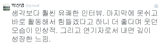 [TRAD] La entrevista fue más placentera de lo que pensé. Al final, cuando dije que él debía sentirse cansado trabajando en forma inmediata sin descansar, él sonrió y dijo que se sentía más feliz de ese modo. Eso me sorprendió, Y sentí que él había madurado más como actor.