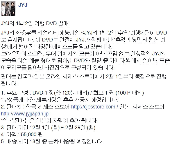 [FACEBOOK] 160129 JYJ Official Facebook Actualización: Informacióon de Venta del DVD de JYJ Reality “Harvest Trip”